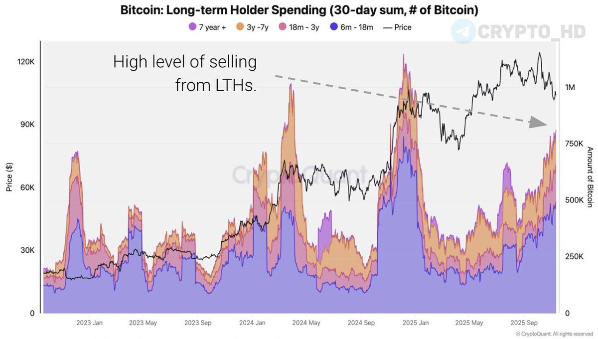 😳 CryptoQuant: Долгосрочные холдеры продали 815,000 BTC ($80b) за последние 30 дней – максимум с января 2024 года.