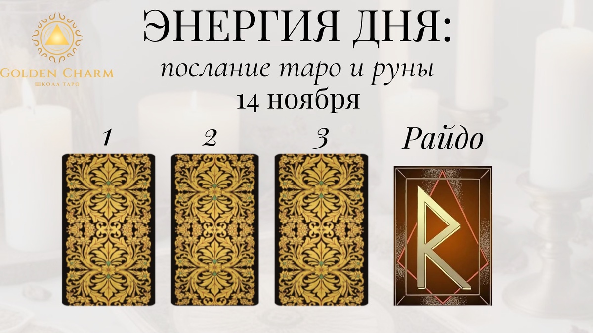 Заказать личный расклад тут✅ Прогноз на 14 ноября : что тебя ждёт Приходи на обучение Таро ✅ Выбери карту — 1, 2 или 3 — и узнай, какой путь для тебя: 1. Паж Жезлов Это день новых идей и вдохновения. Возможно появление наставника или учителя, который поддержит твои начинания. Важно действовать быстро и уверенно. 2. Девятка Кубков Наступил момент насладиться плодами своего труда. День обещает удовлетворение и радость от достигнутых целей. Наслаждайся моментом! 3. Туз Кубков Время эмоционального обновления и глубоких чувств. Это день любви, счастья и гармонии. Открой своё сердце новым переживаниям. Руна дня — Райдо Путешествие и движение вперёд. Сегодняшний день принесёт новые знакомства, интересные события и возможности для роста. Будь открыт переменам. Напиши цифру карты + РАЙДО в комментариях, чтобы активировать энергию. Хочешь личный расклад? Пиши — посмотрим, что ждёт тебя: Заказать личный расклад тут✅ Обучение Таро и Рун — тоже открыто. Спрашивай!