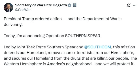 ❗️ Hegseth announces ‘Operation SOUTHERN SPEAR’