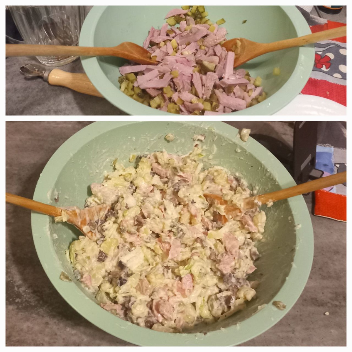 #картофельный #салат с индейкой и грибами #лучший рецепт Количество — на глаз. Ингредиенты: Картошка отварная — 4-5 шт. Индейка* су-вид/в-к — ~250 г Грибы маринованные/отварные — ~ 400 мл Огурцы маринованные — ~ 2/3 банки 680 г Капуста китайская (её можно побольше). Сахар, чёрный перец, майонез, сметана Салат очень сытный😋 1. Отварить картофель в мундире, как для оливье. Остудить и очистить. 2. Картофель нарезать крупными кусочками, индейку — небольшими. Нашинковать китайскую капусту, мелко нарубить огурцы. 3. Смешать подготовленные ингредиенты. Добавить некрупно нарезанные грибы, перец, при необходимости сахар/соль. Заправить сметаной, майонезом, майонезным соусом или миксом. #нюансы *Гастрономию можно любую (ветчина, карбонад и пр.), без жира, не с/к. Грибы тож любые, у меня были свинушки. Подавать не сразу, а обязательно поставить в холодильник, лучше на ночь - обалденный вкус после пропитки😋😋😋