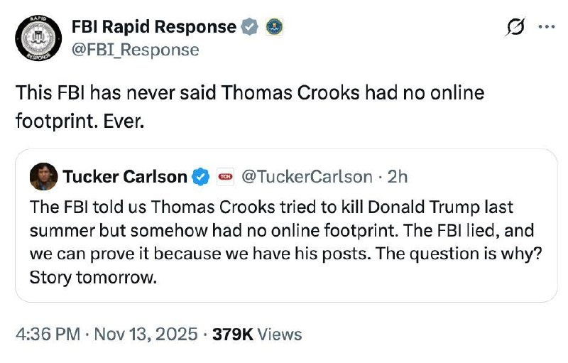 В ответ на пост Nothing to see here! FBI creates a new damage control account just as Tucker Carlson says he has information they tried to hide… ‘The days of bad-faith attacks and fake-news narratives are over,’ the FBI Rapid Response account said in its first tweet