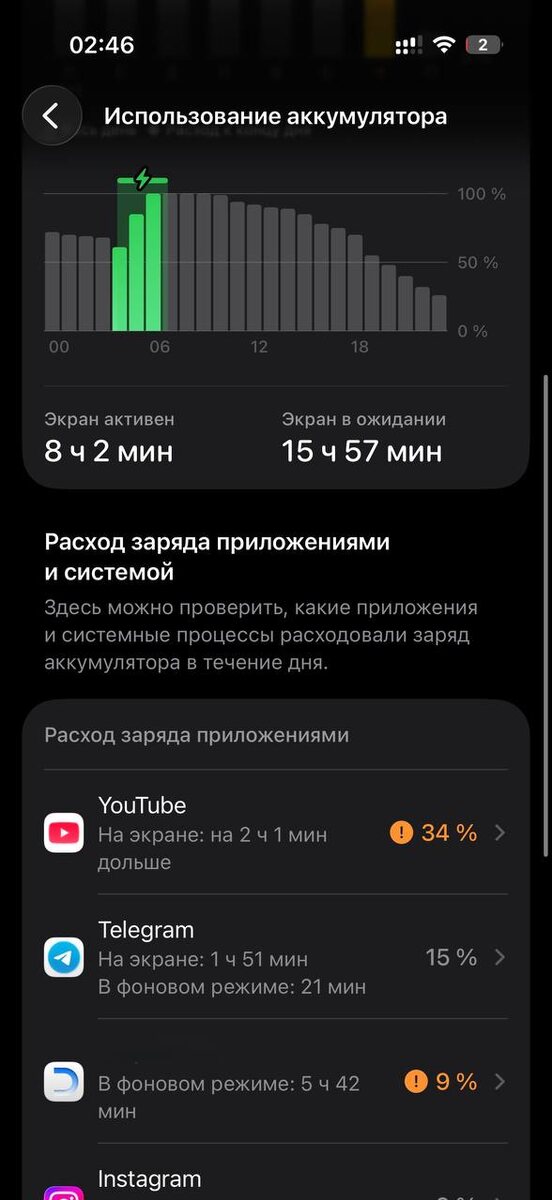 В ответ на пост ⚡️Автономность iOS 26.2 Beta 2 Снял с зарядки в 07:06 и активно пользовался до 09:00 утра, а потом с 14:00. В итоге в 02:46 остается 2%. По условиям все стандартно для меня: LTE на двух симках, вайфай/сотовая сеть 50/50 по времени. Яркость 50%. Как обычно соцсети, браузер, ютуб, навигация. Айфон 17 Про, емкость аккума 100%. Always On и 120гц включены. В итоге около 9 часов экрана. Хуже чем на прошлой бете, но в целом неплохо Как у вас?🤔
