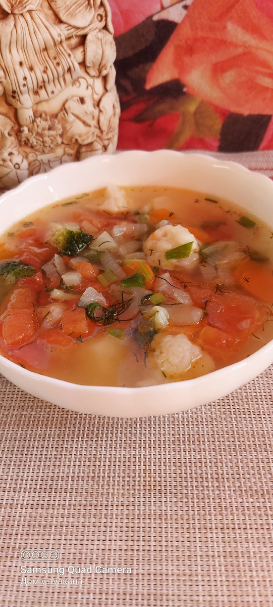 Очень часто хочется поесть чего-нибудь легкого. Для этого случая подойдёт легкий овощной суп из овощей. Набор овощей может быть разным - на ваш вкус. В сотейник налить чуть-чуть растительного масла, добавить нарезанный репчатый лук и морковь. Припустить, чтобы лук и морковь стали мягкими и приобрели обжаренный цвет. Добавить любой мясной бульон. Если хочется прям чего-то вегетарианского, то добавить обыкновенную воду. Положить картофель и чуть-чуть поварить. Затем добавить любые овощи. У меня - цветная капуста, брокколи, помидоры. Летом, в сезон, это могут быть свежие овощи, зимой - замороженные (свои или покупные). Варить 3-4 минуты. Положить лавровый лист, посолить, поперчить по вкусу. В конце варки добавить свежий зелёный лук, укроп, петрушку. Если хотите более сытный суп, можно добавить горсть риса. Рис хорошо сочетается с овощами. #суп #супсовощами #овощнойсуп