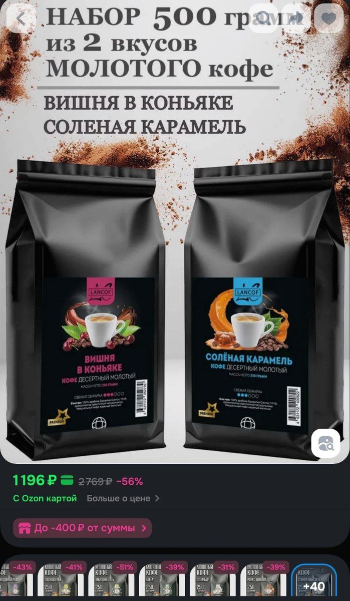 Кофе молотый 250 г набор 2 шт Вишня в Коньяке,Солёная Карамель Lancof https://ozon.ru/t/HU1LkhM