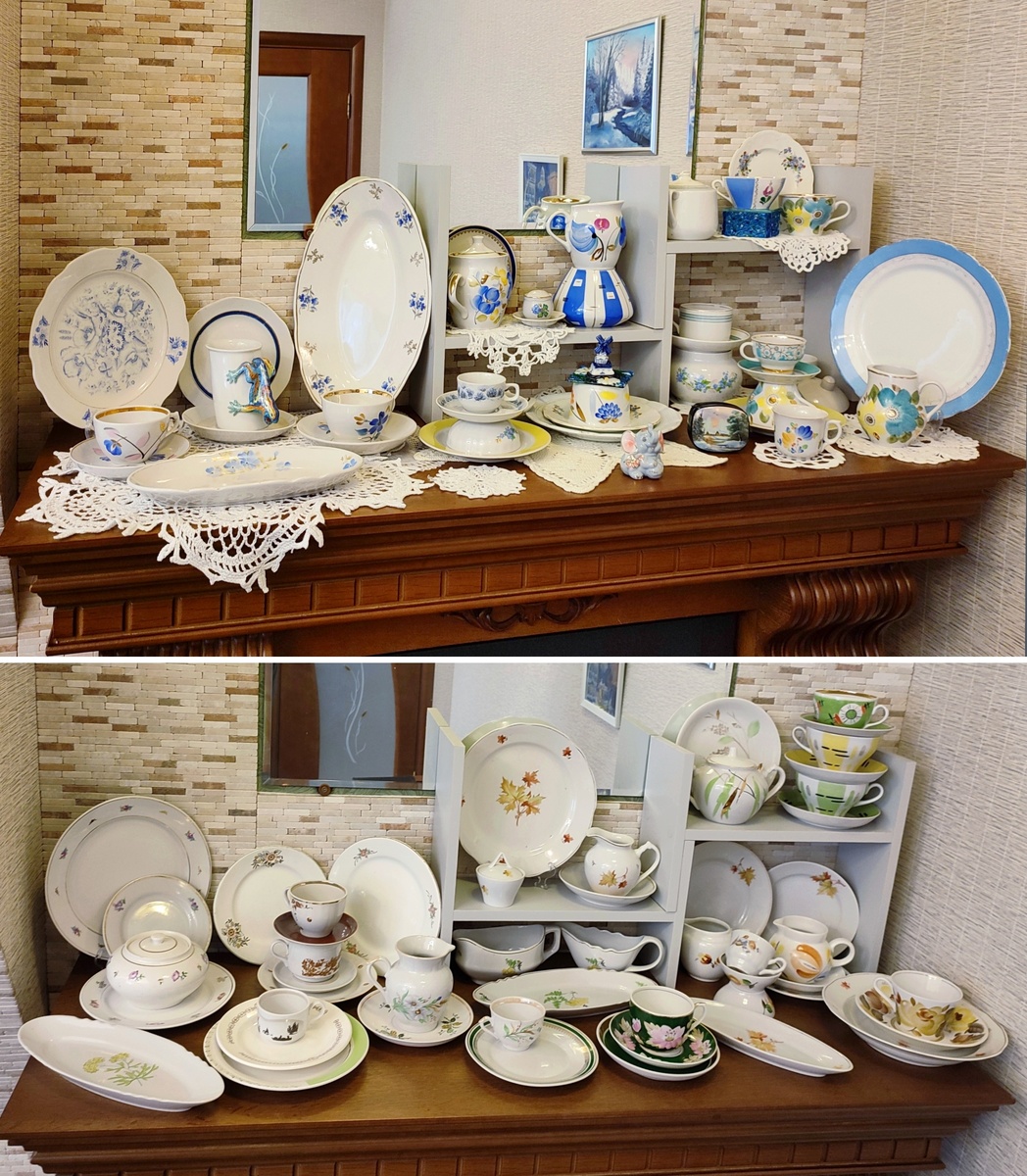 Ну, это календарная зима ещё через неделю начнется, а у нас второй месяц со снегом. Правда за окном он такой, скучный снег, а у меня на полке намного веселее, с цветочками! И сейчас каждый собиратель посуды меня поймет. Натащила я всего много и разного... И всё нравится! Да, в разной степени, но ведь хочется, чтобы глазу было нескучно. Но чтобы при этом цветовой хаос не возникал 🤔 И всё интересное видно было. Ну и поначалу я ставила как придётся, в несколько слоев, более-менее по цветам разбирая, но безыдейно. А потом количество перешло в качество и гора родила мышь пришла в голову идея. Времена года! Каждому времени - свой цвет. Начала я эту идею овеществлять в сентябре, и тогда на каминной полке у меня "кружился лист осенний". В октябре он всё еще кружился, потому что подготовительные работы по смене экспозиции слегка затянулись... И вот, наша осень помахала золотистой ручкой и наступил бело-голубой ноябрь. Да, внизу - белый снег, вверху - голубое небо. Но как объяснили мне в худо
