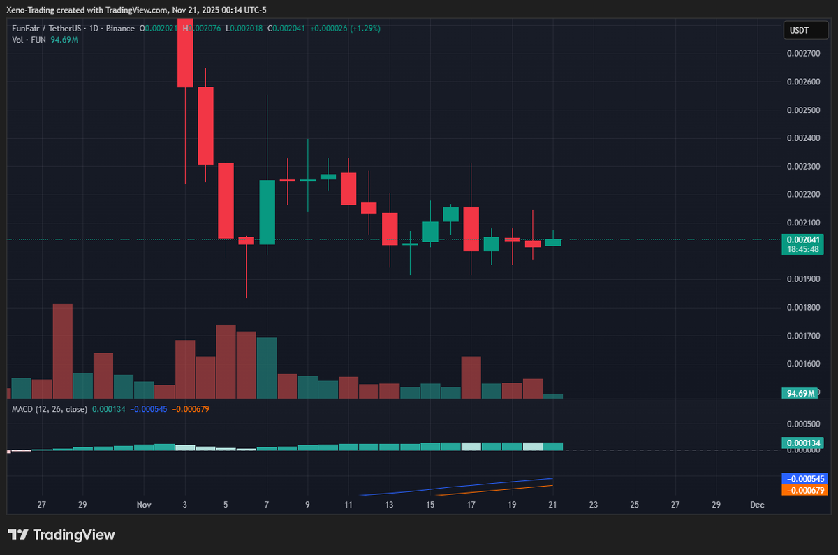 Это технический анализ торговой пары FUN/USDT (Binance) на дневном (1D) таймфрейме по состоянию на 21 ноября 2025 года.