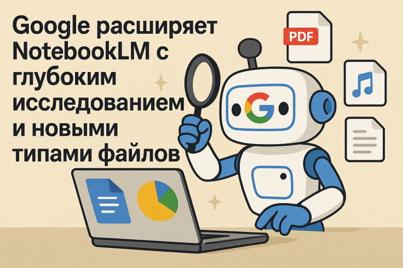 Google представила значительное обновление для своего инструмента NotebookLM, добавив функцию Deep Research и расширив поддержку различных форматов файлов. Эти нововведения делают NotebookLM мощным инструментом для глубокого исследования и анализа данных. Deep Research — это новая функция, которая автоматизирует сложные онлайн-исследования. Она действует как ваш персональный исследователь: принимает ваш запрос, создает план исследования, просматривает сотни веб-сайтов и генерирует структурированный отчет с цитированием источников. Все это можно добавить непосредственно в ваш блокнот NotebookLM. При этом вы можете продолжать добавлять другие источники, пока Deep Research работает в фоновом режиме. ([blog.google](https://blog.google/technology/google-labs/notebooklm-deep-research-file-types/?utm_source=openai)) Теперь NotebookLM поддерживает более широкий спектр форматов файлов: