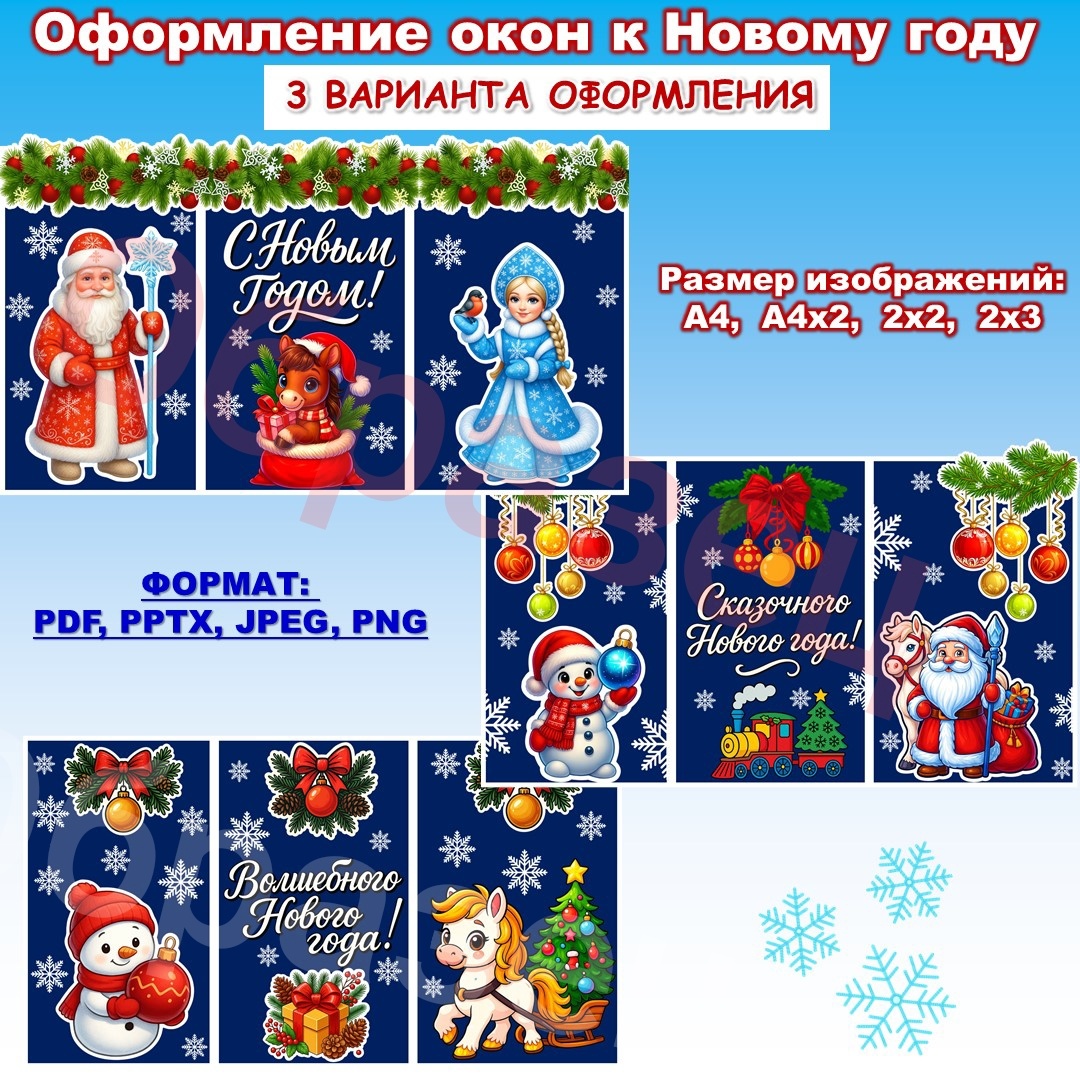 Новогоднее оформление 2026. Оформление окон к Новому году 2026. Создание новогодней атмосферы с помощью украшения окон — это гораздо больше, чем просто декор. Этот процесс помогает погрузить школьников в праздничное настроение, пробудить в них предвкушение чуда и ощутить всю магию приближающегося торжества. Предлагаемый комплект для украшения — это готовое и продуманное решение, которое включает в себя красочные трафареты для вырезания и праздничные надписи. С его помощью можно быстро и без лишних хлопот преобразить пространство. Волшебный набор новогодних стикеров для самостоятельного распечатывания на цветном принтере для украшения класса, окон или домашнего интерьера. В набор входят: - ажурные снежинки разного размера. - плакат Деда Мороза и Снегурочки. - новогодняя гирлянда. - фигура символа года. -снеговик. -новогодняя лошадка с подарками. -новогодний паровозик. -надписи "С Новым годом! ", " Счастливого Нового года! ", " Волшебного Нового года! ". #Новогоднее_оформление, #Но