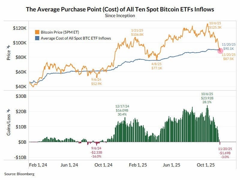 Биткоин рухнул ниже $90K 📉 Рекордные оттоки из ETF BlackRock! Крипторынок переживает серьезное падение — биткоин опустился ниже $90,000 впервые с апреля 2025 года. Цена упала ниже средней стоимости институциональных позиций в спотовых BTC ETF, что вызвало волну паники и ликвидаций. ETF от BlackRock (IBIT) зафиксировал рекордные оттоки — $523 миллиона за один день. Рынок потерял около $1 триллиона капитализации из-за массовых продаж со стороны майнеров и инвесторов. Аналитики предупреждают о возможном дальнейшем снижении, если ключевые уровни поддержки не удержатся. #новости #БезПафосаФинансы #криптовалюты #инвестиции