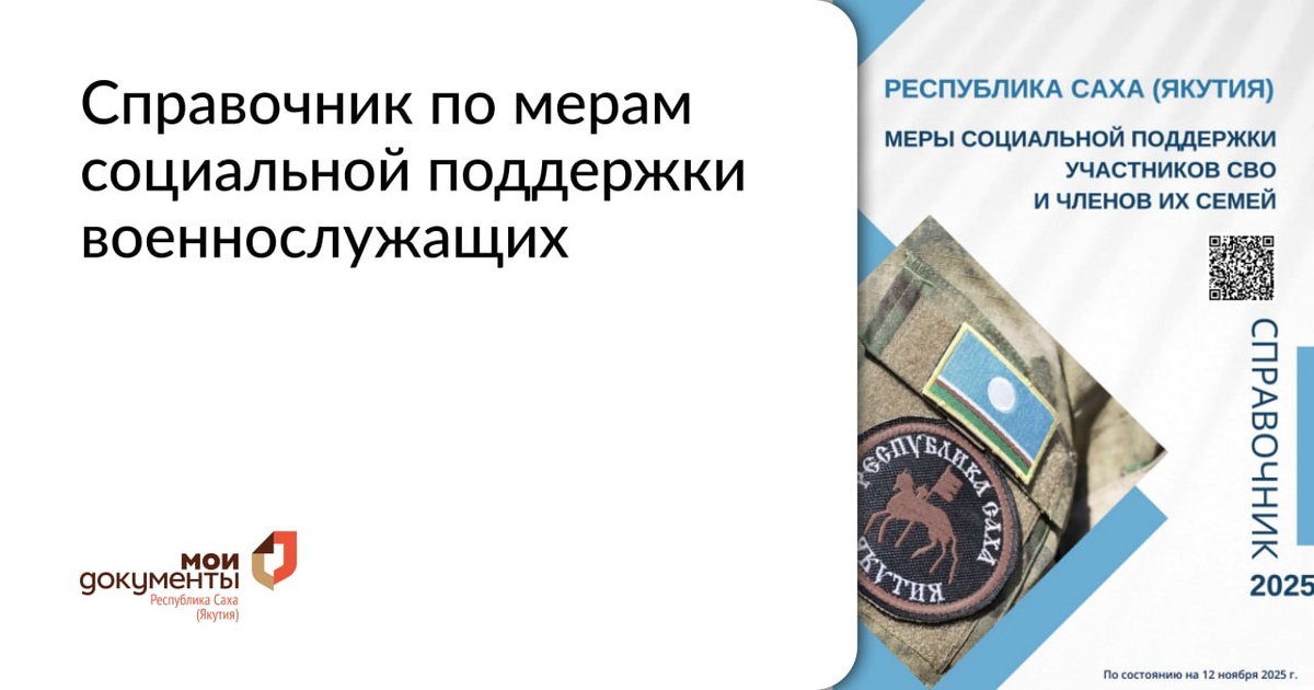🛡 Выпущен актуальный справочник всех мер поддержки участников специальной военной операции и членов их семей ❤️ 🛜Что в новом справочнике? 👉Полный перечень выплат и их размеры. 👉Порядок оформления и необходимые документы. 👉Контакты ответственных органов и организаций. Также вы можете воспользоваться сервисом портала Е-Якутия "Паспорт семьи военнослужащего "Забота" Система сама подберет полный перечень полагающихся льгот и выплат для вашей семьи. ❓Как работает: ➡️Вы отвечаете на вопросы в удобной форме. ➡️Система сама подберет полный перечень льгот и выплат для вашей семьи. ➡️Результаты можно сразу направить себе на почту или распечатать. Ознакомиться со справочником можно на официальном портале центра "Мои Документы": ➡️Специальная военная операция Меры поддержки членам семей военнослужащих и военнослужащих СВО ➡️По прямой ссылке #ГодзащитникаОтечестваРФ #ГодзащитникаРодиныРСЯ