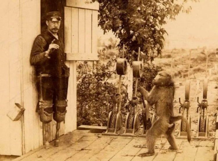 Привет! Иногда жизнь переходит границу между реальностью и сном, и порой бывает очень сложно определить где правда, а где вымысел. Например, как в истории бабуина, работавшего на железной дороге. Да, знаю, что пока в это трудно поверить, но прочитав статью вы откроете для себя эту удивительную историю, которая наверняка удивит вас. Итак, перенесемся в ЮАР XIX века, на небольшую железнодорожную станцию в городе Эйтенхахе, на которой трудился Джеймс Уайт, носящий прозвище "Прыгун". Прозвище прилипло к нему из его неудачного прыжка между вагонами поезда, который стоил ему обеих ног. Но эта катастрофа, не сломала Джеймса, он сделал себе протезы из дерева и продолжил работать на жд-станции. Да было трудно, но у него по сути, не было выбора. Однажды Джеймс прогуливался по рынку, на котором увидел очень смышлёного бабуина, управлявшего повозкой запряженную волами. Причем управлял он ей очень мастерски, даже лучше, чем люди. Джеймса поразил интеллект бабуина и он решил нанять его в свои помощн