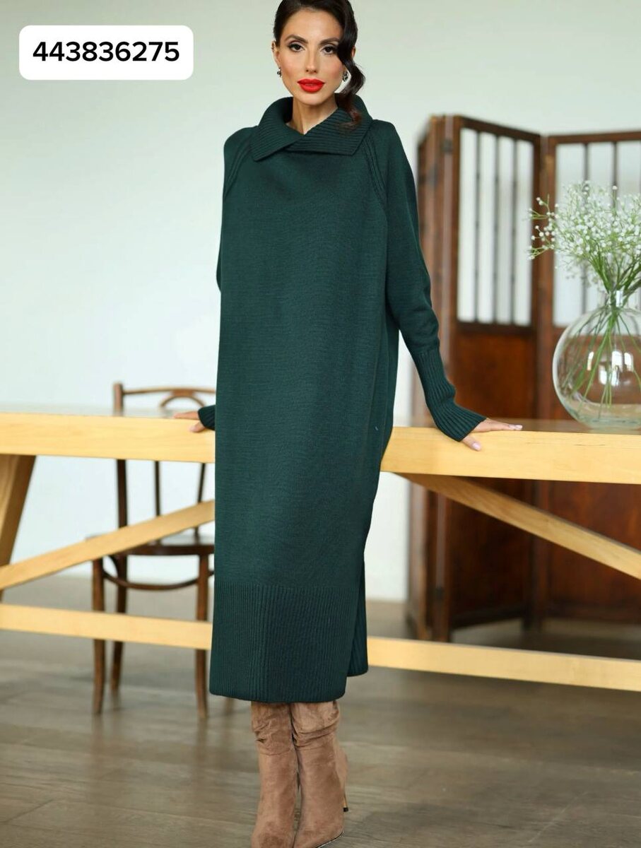 Разрезы по бокам не только добавляют современности, но и значительно облегчают шаг, создавая легкость движения. Благодаря удлинённому силуэту и мягкому плотному переплетению вязки платье согревает лучше многих свитеров и идеально подходит для поздней осени и зимы.