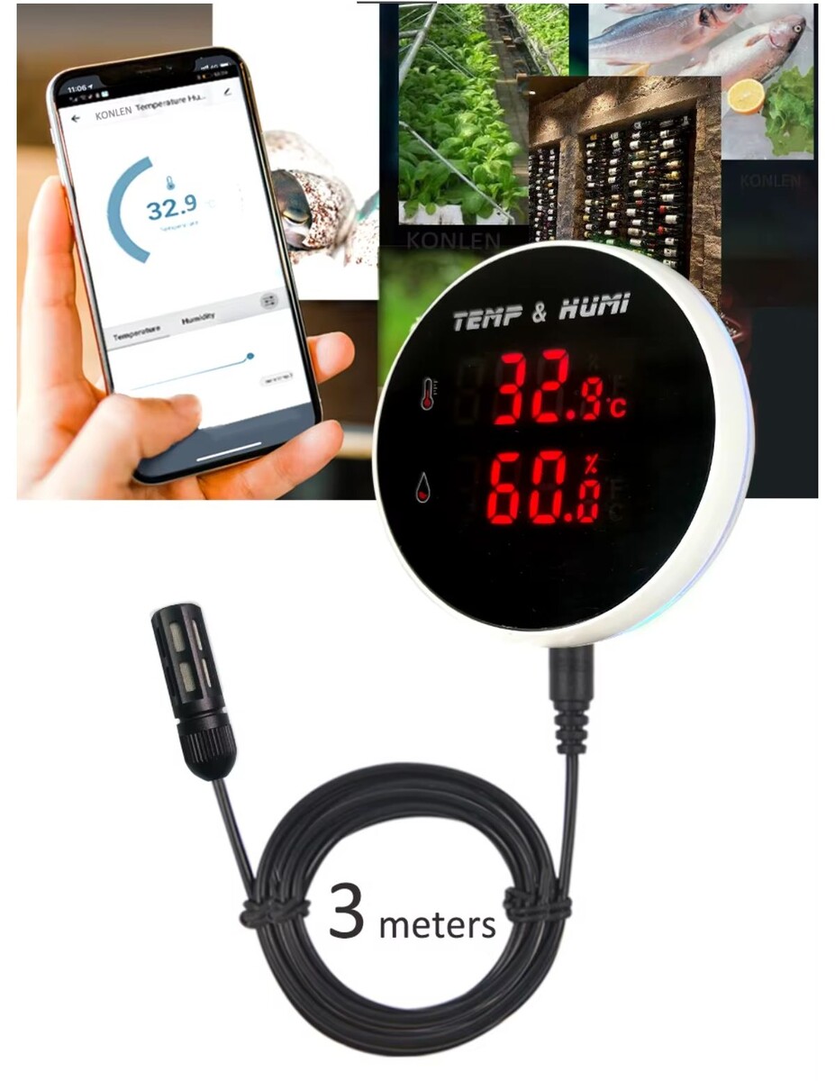 Датчики с круглым экраном. В данном случае датчик от Konlen. Аналогичный продается как Haozee. Два варианта датчика. Датчик температуры во влагозащищенном исполнении и датчик температуры и влажности. Датчик температуры и влажности не влагозащитный. В воду опускать нельзя и не работает при сильном конденсате. Длина кабеля 1 метр и 3 метра. Подключение датчика снизу корпуса на специальный разъем. Параметры продукта Питание от: адаптера питания постоянного тока 5 В, 1 А с USB-кабелем (входит в комплект).