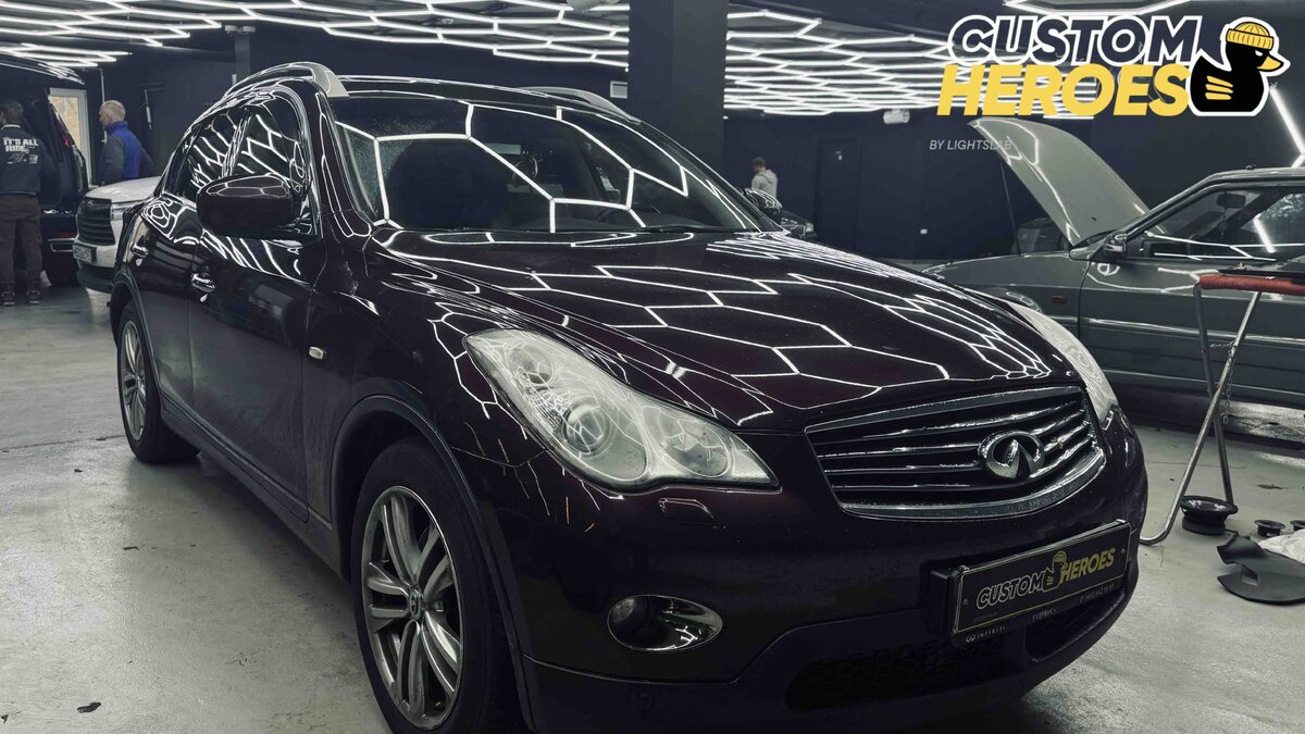 Infiniti EX25 — восстановление фар и установка линз Sariti S7 5500K Infiniti EX25 — элегантный кроссовер премиум-класса, сочетающий спортивный характер и комфорт бизнес-класса. Однако даже самые качественные фары со временем теряют прозрачность, свет становится тусклым, а стекла — мутными из-за пескоструя и воздействия реагентов. Владелец данного автомобиля обратился в Custom Heroes с жалобой на плохое освещение и пожеланием вернуть фарам заводской блеск и мощный свет. После осмотра специалисты выявили: стекла фар были полностью запесочены и имели микротрещины. Внутри фары — выгоревшие отражатели, потерявшие способность формировать правильный световой поток. Штатные линзы больше не обеспечивали должную яркость — в темноте дорогу практически не было видно. Было принято решение заменить стекла на новые, а также установить современные линзы Sariti S7 5500K. Этапы работ Sariti S7 — это передовые LED би-линзы нового поколения. Они оснащены двумя светодиодными чипами и двумя отражателями, чт