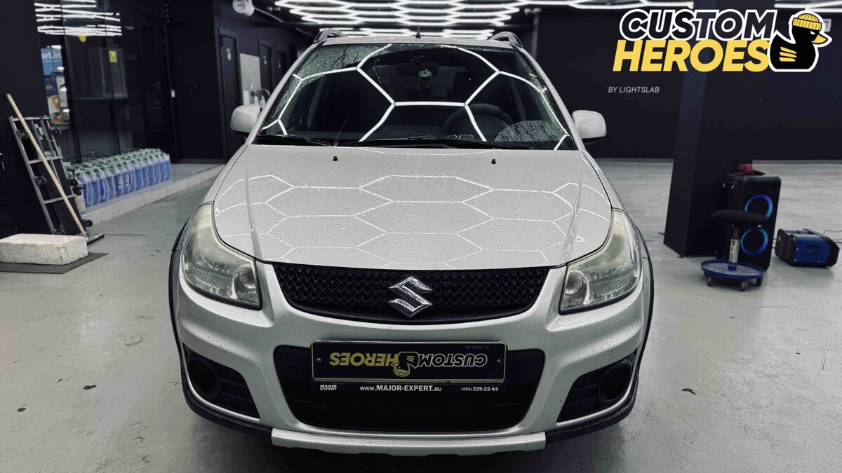 Suzuki SX4 — замена фар, восстановление света и защита полиуретаном Suzuki SX4 — популярный кроссовер, известный своей надёжностью и универсальностью. Однако даже на таких автомобилях со временем ухудшается состояние передней оптики: фары мутнеют, покрываются микротрещинами и теряют яркость из-за воздействия ультрафиолета, реагентов и песка. Владелец обратился в Custom Heroes с проблемой — тусклый свет фар и неэстетичный внешний вид передней части автомобиля. После детальной диагностики наши специалисты установили, что стекла фар сильно запесочены и помутнели, а внутри появились следы износа герметика. Было принято решение произвести полную замену передних фар и выполнить их дополнительную защиту полиуретановой плёнкой. Мы используем только качественные плёнки премиум-класса от проверенных производителей (SunTek, Hexis, STEK, Llumar). Такие материалы обладают высокой прозрачностью и устойчивостью к внешним воздействиям. Основные преимущества: После работ фары Suzuki SX4 полностью преоб