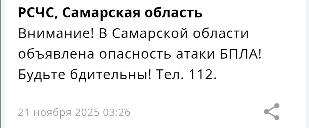 ❕ Сегодня ночью в Самарской области объявлена опасность атаки БПЛА!! Будьте бдительны!