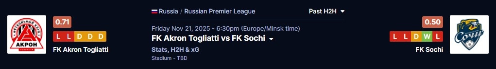 Всем привет. Сегодня разберём матч, который в таблице ничего не решает, но для нас с вами может быть очень даже интересным. «Акрон» принимает «Сочи». Две команды, у которых сезон не задался, но которые от скуки точно не страдают. Давайте посмотрим правде в глаза. Этот матч — не «блокбастер» в духе «Зенит» — «Динамо». Это скорее инди-драма с претензией на артхаус. Но именно в таких постановках и рождаются самые сочные сюжеты для наших с вами ставок. «Акрон» (Тольятти): Скромные трудяги с волжской закалкой. Играют жестко, иногда даже слишком, дома не стесняются ставить штакетник перед своими воротами. Их стиль можно охарактеризовать как «терпи, владей, жди своего шанса, а если не дождешься — ну хоть очко одно возьмем». Команда, которая знает цену труду и чужим ошибкам. «Сочи»: Ах, «Сочи»! Команда-загадка, команда-калейдоскоп. В прошлом сезоне они были королями атаки, а сейчас напоминают туриста, который потерял карту и пытается найти пляж в центре города. У них есть имена (Юрий Газин, Ма