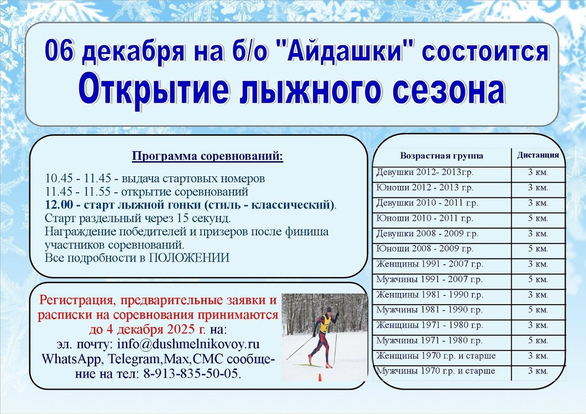 В Ачинске состоится открытие лыжного сезона 😍 Открытие зимнего соревновательного сезона 2025-2026 состоится классической гонкой. Старт - база отдыха «Айдашки». ❗️ВАЖНО❗️ Участники, не подавшие заявки до 4 декабря, к участию не допускаются. Подробнее - в карточке и прикрепленном положении.