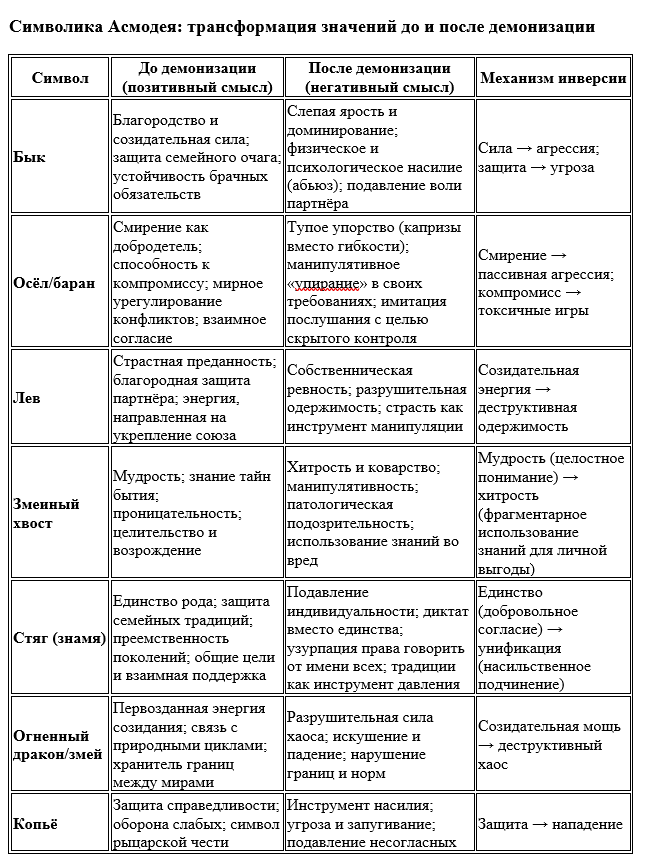 Ключевой принцип сакральной трансформации: при демонизации символы не исчезают — они инвертируются, сохраняя внешнюю форму, но меняя смысловое наполнение на противоположное. Разберём гипотезу детально. Общий принцип трансформации Инверсия символов строится по схеме: Добродетель → её искажённая тень - Благородство → садизм - Смирение → пассивная агрессия - Страсть → одержимость Это отражает универсальный мифологический паттерн: демонизация не создаёт новые образы, а переворачивает существующие, показывая, как любая положительная черта при избытке или искажении становится пороком. Такая символика напоминает о хрупкости добродетелей — даже благородство может стать орудием зла при потере баланса; служит предупреждением: отношения разрушаются не внешними силами, а искажением изначально здоровых начал. Она подчёркивает дуализм природы. один и тот же символ может нести противоположные смыслы в зависимости от контекста. Основной механизм: демонизация — не замена символов, а их смыслов