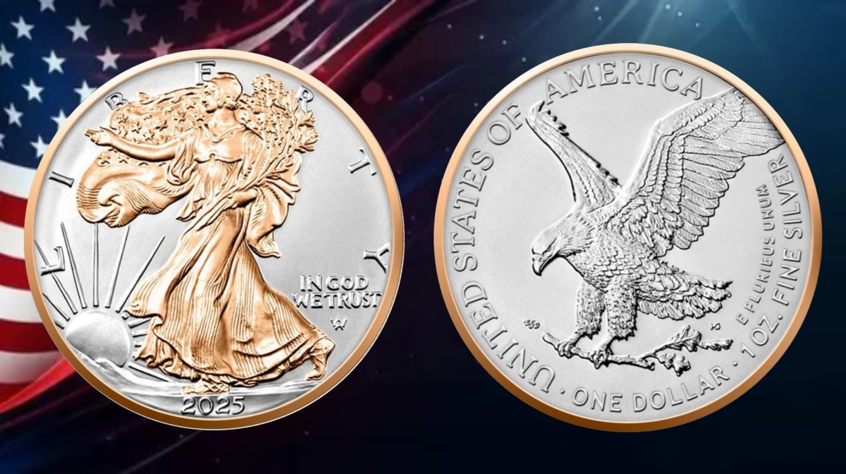 Серебряная монета 1 доллар США 2025 года «Шагающая Свобода» в красном золоте на ярком серебряном фоне