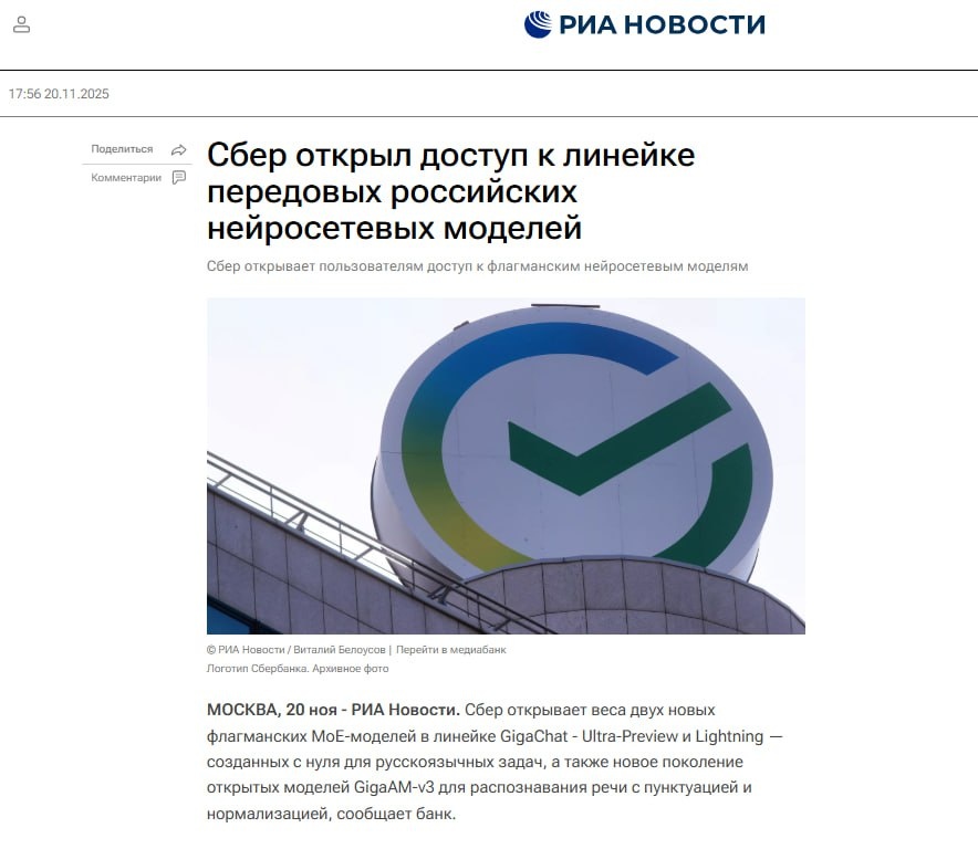 Сбер опубликовал в открытом доступе новое поколение своих моделей ИИ — GigaChat 3 Ultra Preview (Топ-1 на MERA) и GigaChat 3 Lightning