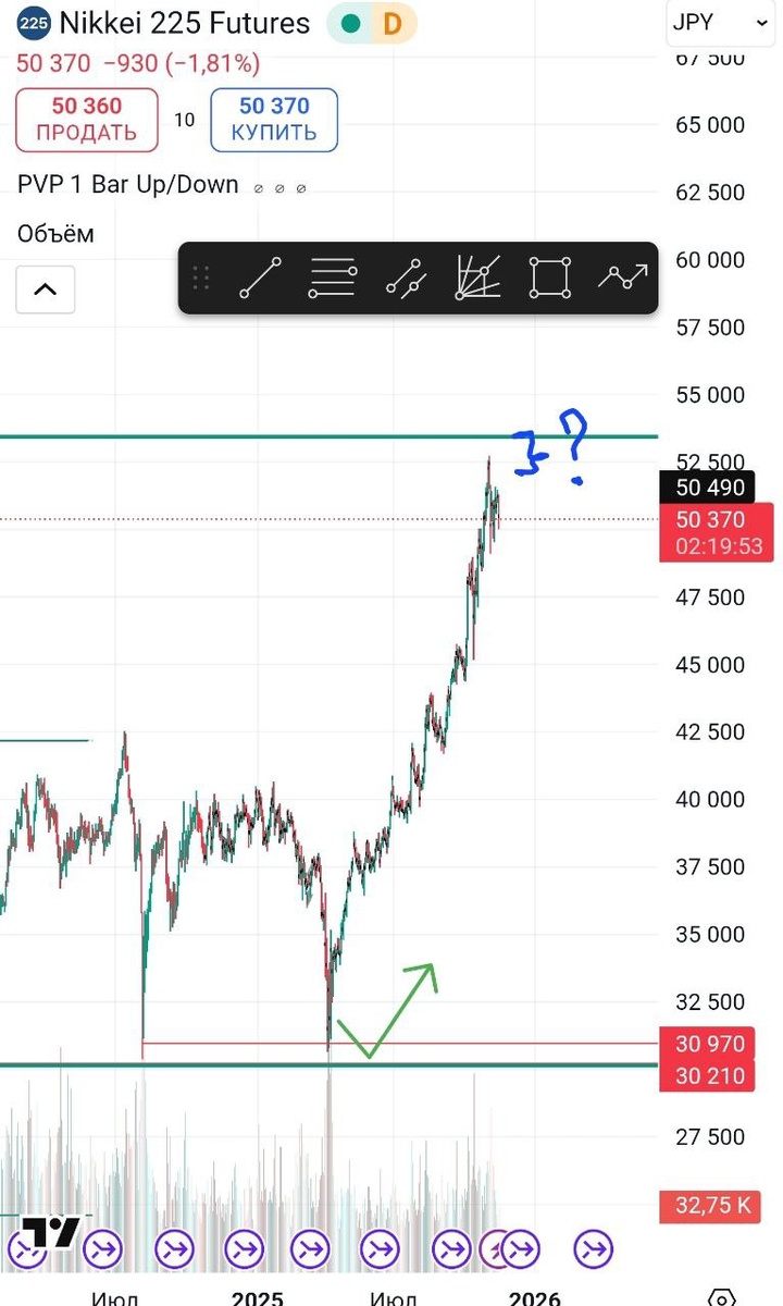 📉 Есть кое-что, что меня откровенно беспокоит. Это график Nikkei. Вы его видели у меня много раз. Вы знаете точку, которую я жду — ту самую финальную вершину перед началом паники. И сейчас на графике — недоход. Маленький. Почти незаметный. Но вопрос простой и неприятный: 👉 Считать ли этот микроскопический зазор допустимой погрешностью модели? Или всё-таки это шанс на то, что мы ещё НЕ дошли до той точки апокалипсиса? Пока что я склоняюсь ко второму. Меня немного успокаивает то, что S&P 500 тоже ещё не сделал свои ожидаемые 7400. А я уже писал: достаточно, чтобы ОДИН из ключевых индексов дошёл до своей цели — и коррекция начнётся. И что мы имеем сейчас? — у Nikkei есть незначительный недоход, который я пока не могу назвать выполнением модели; — у США начинается движение вниз; — вероятность «ещё одного рывка» остаётся, и я всё ещё делаю ставку именно на этот вариант. Но честно: если бы Nikkei коснулся цели идеально — я бы уже не сомневался ни секунды и прикрыл бы свои активы. С