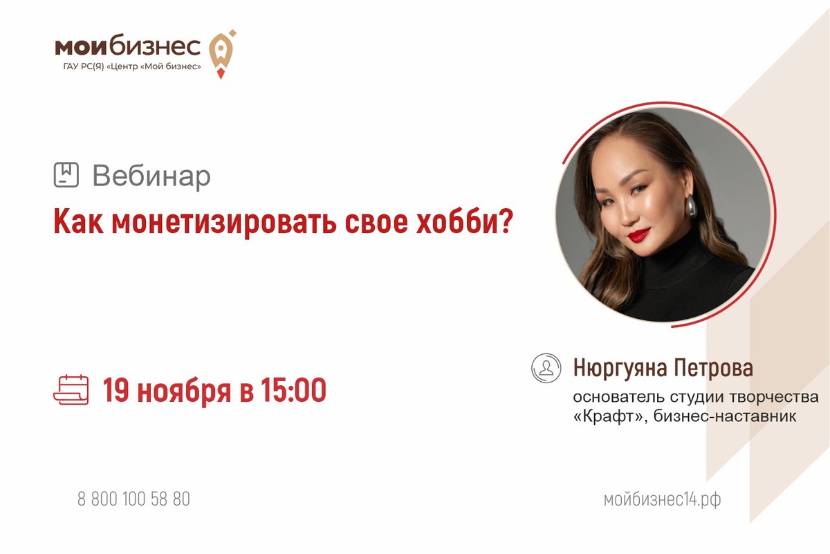 🚀Центр «Мой бизнес» приглашает принять участие в вебинаре «Как монетизировать свое хобби?». ✔️Спикер поделится проверенными методами, как сделать первый шаг к созданию прибыльного бизнеса на основе своего хобби. Вы получите практические рекомендации для реализации своей бизнес-идеи. 📌Вы узнаете: ✔️Какие первые шаги предпринять, чтобы начать зарабатывать любимым делом. ✔️Эффективные способы и советы продвижения творческого проекта и развития личного бренда. ✔️Как систематизировать бизнес. 🎙Спикер: Нюргуяна Петрова основатель студии творчества «Крафт», бизнес-наставник 📆Дата: 19 ноября ⏰Время: 15.00 🔗Ссылка для регистрации: https://forms.yandex.ru/cloud/6913ddbb9029028d6ce7cbb8 Развивайте бизнес с нами! @moibizsakha
