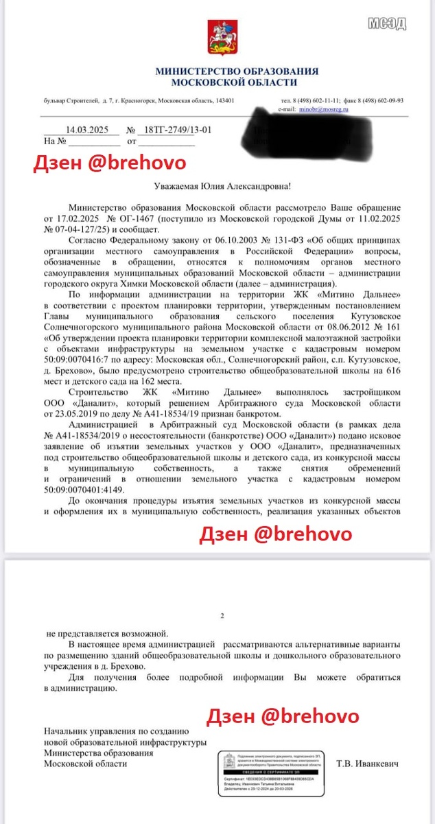 Можно порадоваться, что в ЖК Митино Дальнее все-таки построят сад и школу, только это случится небыстро: с учетом реконструкции старой брёховской 19 школы вообще какое-то время дети будут вынуждены ездить учиться в Зеленоград, Рузино или Лунево.