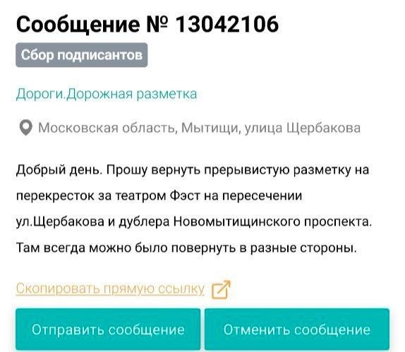В ответ на пост От подписчицы. Прошу жителей города поддержать обращение о восстановлении прерывистой линии в Мытищах за театром Фэст на пересечении ул. Щербакова и дублера Новомытищинского проспекта. https://vmeste.mosreg.ru/claims/13042106 Что то подсказывает, что в этом случае разметку не вернут, так как ранее поворачивающие занимали целый ряд, а сейчас полоса свободна. Яндекс по привычке показывает наличие этого поворота. Будьте внимательны, может прийти штраф с камеры (если ее туда повесят) за две сплошных!