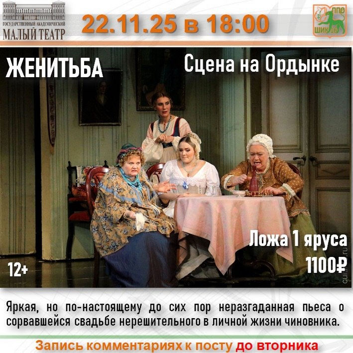 🎭 Спектакль «Женитьба» 📆 22 ноября в 18:00 🏛️ Малый театр, сцена на Ордынке 👛 Стоимость 1100₽ 🎫 В наличии 5 билетов Действующие лица и исполнители: Агафья Тихоновна, купеческая дочь, невеста М.Дунаевская М.Кривенцева Е.Порубель Арина Пантелеймоновна, тётка народная артистка России Л.Полякова Фёкла Ивановна, сваха народная артистка России И.Муравьева заслуженная артистка России И.Иванова Подколесин, служащий, надворный советник Д.Сафонов Кочкарёв, друг его народный артист России А.Вершинин и др. Яичница, экзекутор народный артист России В.Афанасьев народный артист России А.Клюквин Анучкин, отставной пехотный офицер народный артист России А.Ермаков Жевакин, моряк народный артист России В.Дубровский Дуняшка, девочка в доме Е.Казакова В.Князева Стариков, гостинодворец заслуженный артист России С.Тезов и др. Степан, слуга Подколесина заслуженный артист России С.Тезов и др. 📝Запись в комментариях к посту или в ЛС ☎️Убедитесь, что Ваша заявка принята! Сообщите председателю ППО #Мой