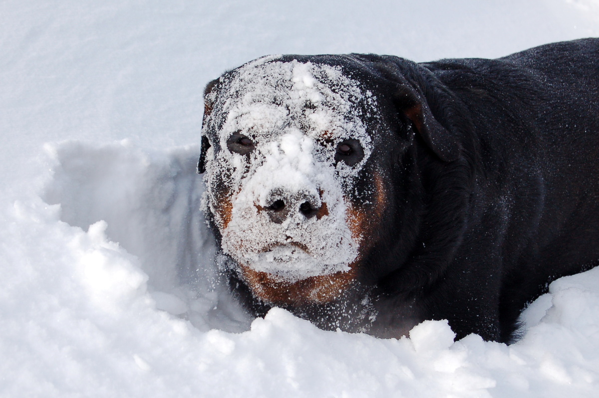 Ротвейлер весь взъерошенный, он ещё не в себе…