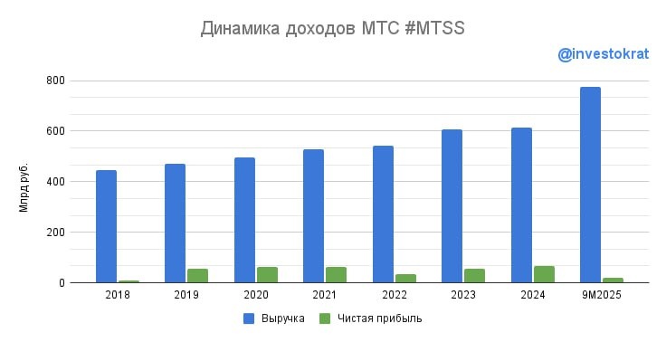 В прошлый раз я писал, что МТС может стать спекулятивной идеей под снижение ставки. Свежий отчет за 3 квартал это подтверждает! Он получился достаточно неплохим. 🚀 Главный прорыв случился в росте выручки: +18,5% г/г. Основное направление бизнеса (мобильная связь и интернет для населения) показывает уже 2 подряд сильных квартала. Помогла индексация тарифов с 1 марта. 💼 Отдельно стоит отметить результаты B2B-сегмента: +19% г/г. Главная причина успеха - цифровые сервисы: услуги по кибербезопасности, интернет вещей, видеонаблюдение и корпоративные ИИ-решения. 🛴 Другие экосистемные направления тоже чувствуют себя неплохо. Банк растет на 39,6%, рекламный сегмент на 16,5%. Юрент увеличивает поездки двузначными темпами, вытесняя с рынка Whoosh. Ждем IPO новых направлений, оно должно помочь раскрыть стоимость и снизить долговое напряжение. 🤔 Кстати, а что там с долгом? Выручка это хорошо. Но камень преткновения МТС - процентные расходы, платить которые в последнее время стало совсем тяжк