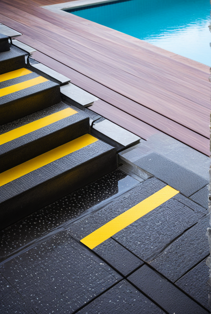 Основное отличие — в материале и тактильных ощущениях. Самоклеящаяся абразивная лента на основе из ПВХ обычно имеет зернистую поверхность, обеспечивающую максимальную абразивность и износостойкость. Она идеальна для зон с высокой проходимостью, таких как крыльцо или пандус. В свою очередь, резиновая лента эластична, не имеет абразивных частиц, она мягче и комфортнее для ходьбы босиком. Ее основная сфера — это укладка на пол в душевых, раздевалках и вокруг бассейнов, где особенно важна травмобезопасность на мокром, но гладком полу.
