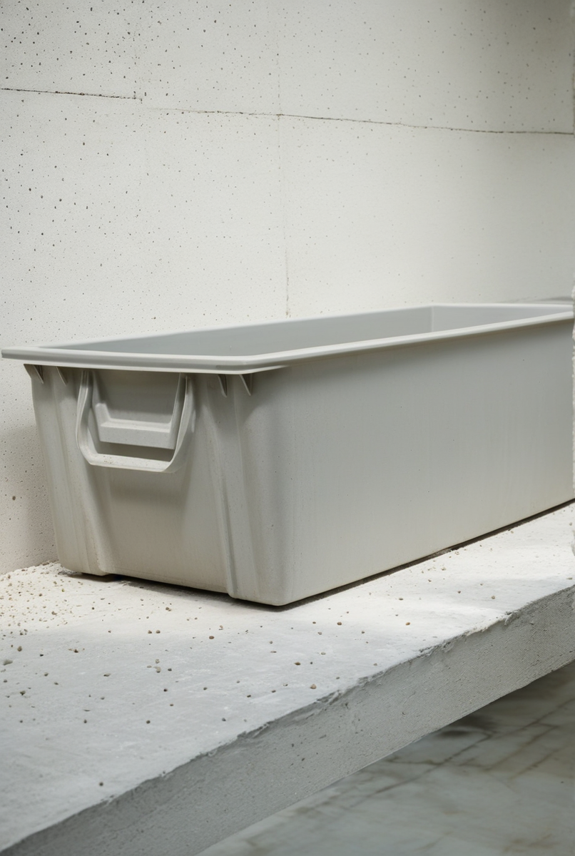 Квадратная форма обеспечивает большую устойчивость. В отличие от круглых тазов, пластиковый ящик с прямыми углами не позволяет строительному миксеру «гулять» по емкости, делая процесс смешивания более контролируемым. Из углов гораздо удобнее извлекать остатки раствора лопатой, что сокращает потери материала. Это делает его оптимальным выбором как для бетона, так и для других сыпучих материалов.