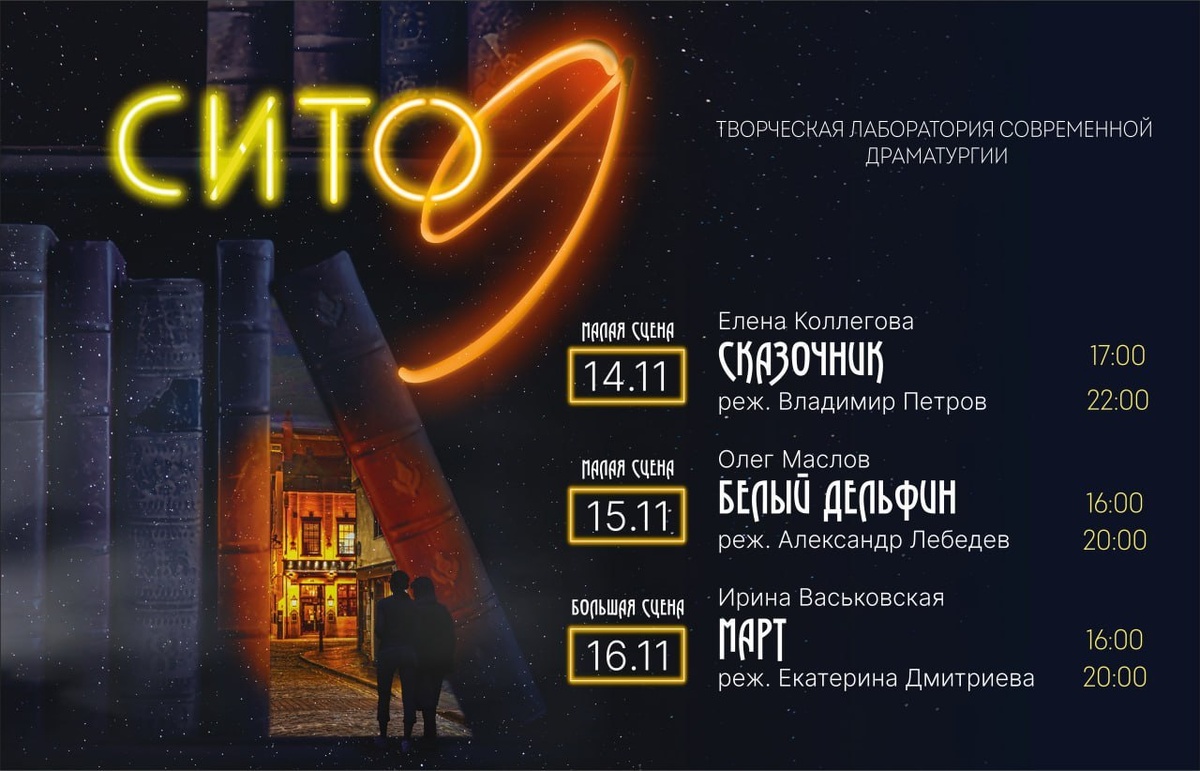 С 14 по 16 ноября Воронежский драматический театр проведет девятую творческую лабораторию «СИТО» (Современные Исследования Театральных Объектов). В рамках проекта на большой и малой сценах будут представлены эскизы трех спектаклей по произведениям современных драматургов, отобранные для возможного включения в постоянный репертуар. 14 ноября в малом зале состоится показ пьесы Елены Коллеговой «Сказочник» под руководством художественного руководителя театра Владимира Петрова. Произведение, отмеченное на конкурсе «Плечом к плечу», рассказывает о сложностях возвращения к мирной жизни после участия в СВО. 15 ноября зрители увидят работу Олега Маслова «Белый дельфин» в постановке Александра Лебедева, исследующую тему внезапного жизненного перелома. 16 ноября в большом зале представят пьесу Ирины Васьковской «Март» о парадоксах любовных отношений в современной интерпретации Екатерины Дмитриевой. Особенностью лаборатории станут традиционные обсуждения после каждого показа, где зрители смогут н
