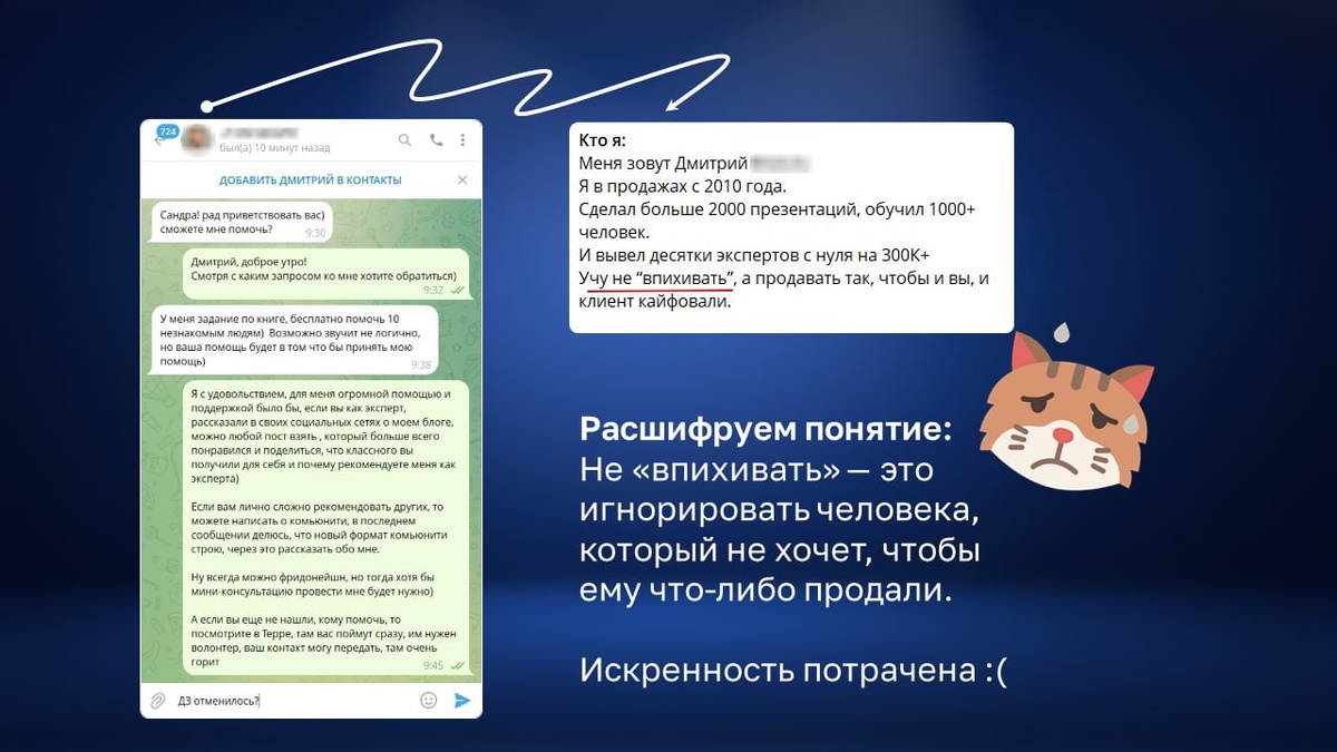 Аааа, наболело 😾 Состою в большом количестве сообществ, из которых некоторые ушлые ребята парсят (крадут) данные. Потом залетают с комментарием: «Привет, дорогая/милая, мы обе состоим в комьюнити/чате X, хотела...», — смотришь профиль, а общих групп нет, контакт создан месяц назад и зарегистрирован с какой-нибудь зарубежной симки. Сразу фамильярное отношение с переходом на «ты» и нарушением границ с этими ласковыми обозначениями. Бррр Но вчера случился какой-то апофеоз креативного маркетинга🐱 Разберем на составляющие и сделаем выводы. Схема AIDA (смотрим скрин): 1️⃣ A — Attention (внимание). В начале приветствие и общий вопрос. Почему так? Потому что люди, которые сразу говорят о себе, направляются в бан сразу, а здесь остается определенный % того, что тебе ответят. В вопросе пока нет конкретики, что нужно, срабатывает интерес узнать, что там дальше, кто такой пишет (переход ко 2-ой части прогрева). ✏️ На заметку: В целом неплохой вариант на холодку, без панибратства, на вы.
