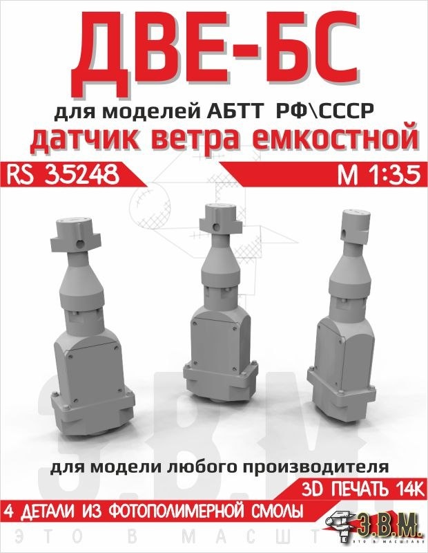 Э.В.М. выпустили Датчики ветра ДВЕ-БС в 1/35 масштабе. В основе набора лежат собственные натурные измерения и КД. ДВЕ-БС - это ключевые приборы в автоматизированных системах управления огнём, предназначенные для измерения скорости и направления ветра на бронетехнике. Они устанавливаются на основном вооружении и командных бронемашинах советского и российского производства, в первую очередь на танках Т-72, Т-80, Т-90 и их модификациях, а также на боевых машинах пехоты и бронетранспортёрах. Встречается так же на некоторых модернизированных версиях Т-64. Конструктивно датчики монтируются на верхней части башни или корпусе машины, в местах, минимально подверженных ветровым завихрениям, чтобы максимально точно считывать параметры внешнего воздушного потока.
