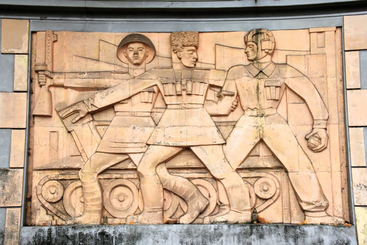 Барельеф с изображением советских солдат на территории кладбища