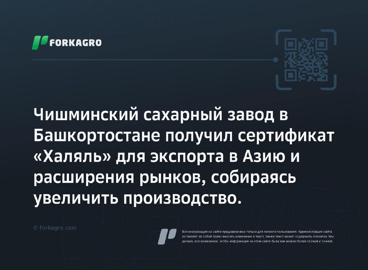 Чишминский сахарный завод в Башкортостане получил сертификат «Халяль» для экспорта в Азию и расширения рынков, собираясь увеличить производство. Чишминский сахарный завод в Башкортостане получил сертификат «Халяль», позволяющий экспортировать продукцию в страны Азии. Завод соответствует жестким исламским стандартам производства. Объем экспорта составляет 50-60% продукции и расширяет рынки сотрудничества. Увеличение производства белого сахара на 20% и гранулированного жома на 10% планируется увеличить на 14% переработку сахарной свеклы в следующем сезоне. Перейти к источнику