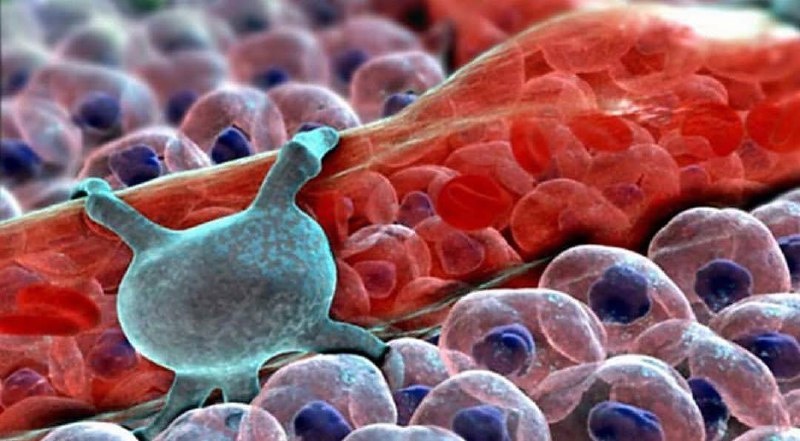 Перициты (зеленые) находятся на капиллярах. Перициты регулируют капиллярный кровоток