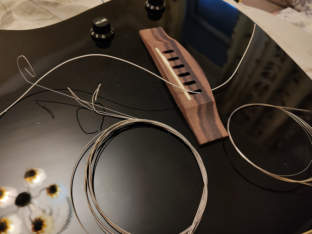 Если совсем в перфекционизм лезть, то еще вопрос, правильно ли сидит бридж относительно нужного положения по мензуре, или тоже на миллиметр-другой мажет. Но такие вещи оставим для сильно более дорогих гитар и сильно более привередливых клиентов. Я обошёлся только подгонкой по высоте.