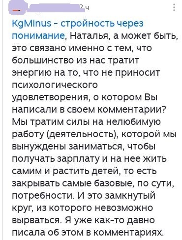 И в обсуждениях к статье автор комментария (который сейчас разбирали выше) узнала свою ситуацию, что позволило психике пойди дальше, приблизиться к пониманию себя: