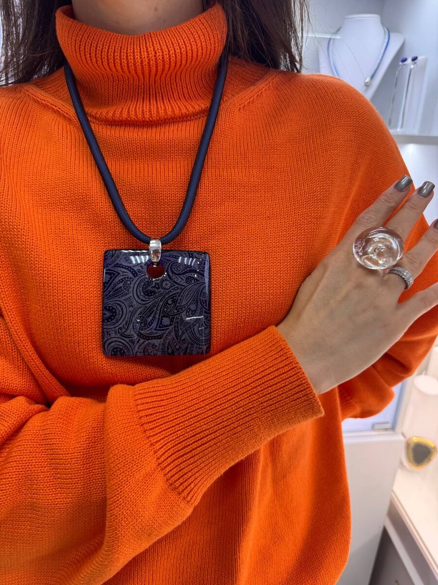 Кулон из стекла с тонким пейсли-узором — универсальная вещь, которая легко собирает образ даже на обычном свитере