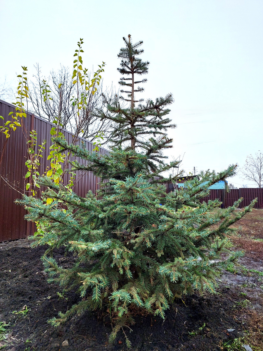 Весь сезон я не тратилась на покупку многолетников, держа в голове то, что осенью предстоит крупная покупка для сада. Несколько недель ходила лисой вокруг мужа, рассказывая, что мне очень нужна ёлочка... и именно в этом месте, между мангалом и забором, что все хотят новогоднюю ель, и нам надо. Была так убедительна, что на момент покупки у мужа не было сомнений, а у меня - проблем с поиском машины для доставки - Дима всё решил сам. И вот, в начале ноября моя мечта сбылась - старенькая тентованная Газелька привезла мне полутораметровую красавицу. Цвет слегка сизый. Хотела именно такую- не зелёную и не ярко- голубую, а промежуточный оттенок. Знаю- знаю, понятный плотный зеленый цвет- беспроигрышный вариант. Но у меня уже есть " почти голубая" ель, и её надо было подружить с новой. Дождливый ноябрь - хорошее время для посадки. За зиму почва в посадочной яме обляжется, и с первыми весенними водами корневая начнёт работать, наращивая объем. Кстати, корневой ком я не трогала - посади
