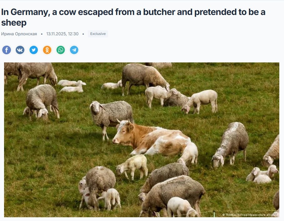 В Германии корова сбежала от мясника и притворилась... овцой. Корову по кличке Мюке отправили на бойню, но она сбежала и прибилась к овцам. Что интересно, она отлично вписалась в их компанию — даже когда пастух попытался отгородить Мюке загоном, корова его сломала и вновь затесалась в толпе овец. Сначала Мюке усыпили и вновь отправили на бойню, но тут вмешались зоозащитники. Они открыли сбор средств и теперь корова будет жить на другой ферме без угрозы для жизни. Корова, которая смогла. Бесплатный GPT-bot ⚡️НейроМастер⚡️