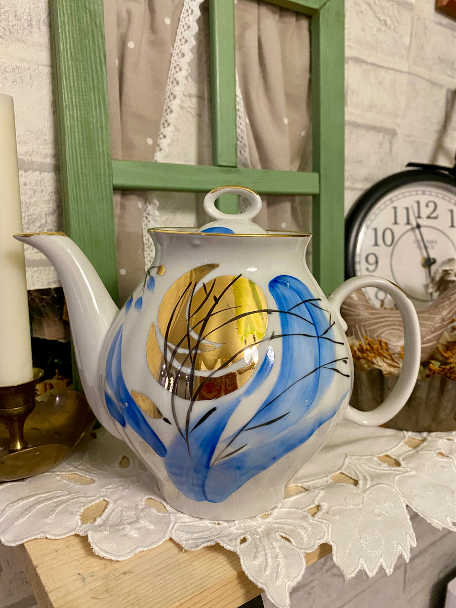 За окном такое унылое кино показывают последнее время, что душа настойчиво требует ярких красок. И их есть у меня. Я отдыхаю в компании с винтажным фарфором. Это моя отдушина от работы (да, Лисья нора - это хобби и моя третья детка), от уроков и быта. И дома у меня не только моя собственная посуда, но и находки, которыми я по воле случая делюсь с подписчиками телеграмм-канала. Поставщик счастья - можно меня так обозвать?😁 Пусть они ко мне только переночевать приходят, но все равно это прекрасная возможность попробовать фарфор на зуб, воочию оценить атласный блеск и причудливые рисунки. Сегодня традиционный обзор красивой посуды, которая блистала в моей тележке с винтажами☕️. Вы только посмотрите на эту дулевскую красоту! Ручная роспись чиста и свежа, натуральное январское утро. Недаром этот декор называется «Зимнее солнце». Золото горит на белоснежных фарфоровых бочках, и под аккомпанемент голубых всполохов так и видится заснеженное поле, блистающее на солнце. Или высокое ясное небо.