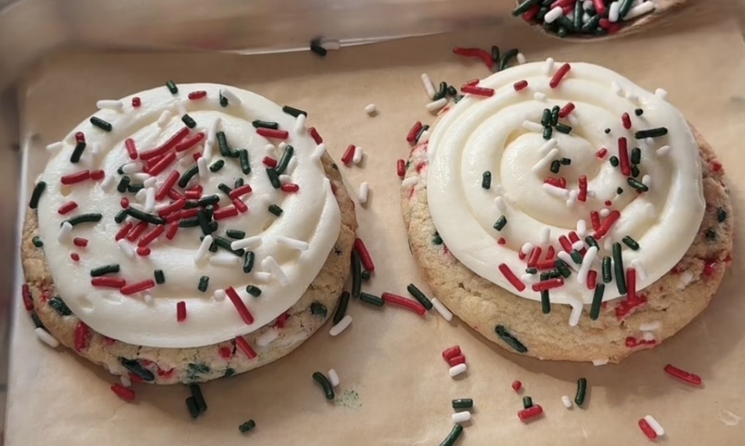 Идеально мягкое, праздничное и такое красочное! Это печенье — настоящий символ Рождества! Оно мягкое, нежное и буквально усыпано веселой разноцветной посыпкой, которая создает неповторимое праздничное настроение. А завершает картину облачко воздушной глазури из сливочного сыра. Готовьтесь наполнить дом уютом и ароматом праздника! --- Выход: около 15-18 печений Время подготовки: 20 минут Время выпекания: 10 минут --- Ингредиенты Для печенья: · 2 стакана + 2 ст. л. (255 г) муки · ¼ ч. л. разрыхлителя · ½ ч. л. пищевой соды · ¼ ч. л. соли · 10 ст. л. (141 г) несоленого сливочного масла, размягченного · ½ стакана (100 г) сахарного песка · ⅓ стакана (71 г) светло-коричневого сахара, утрамбованного · 1 крупное яйцо, комнатной температуры · 1½ ч. л. ванильного экстракта · ¾ стакана (120 г) праздничной посыпки + еще для украшения Для глазури из сливочного сыра: · 170 г сливочного сыра, размягченного · 5 ст. л. (70 г) несоленого сливочного масла, размягченного · 1 ч. л. ванильного экс