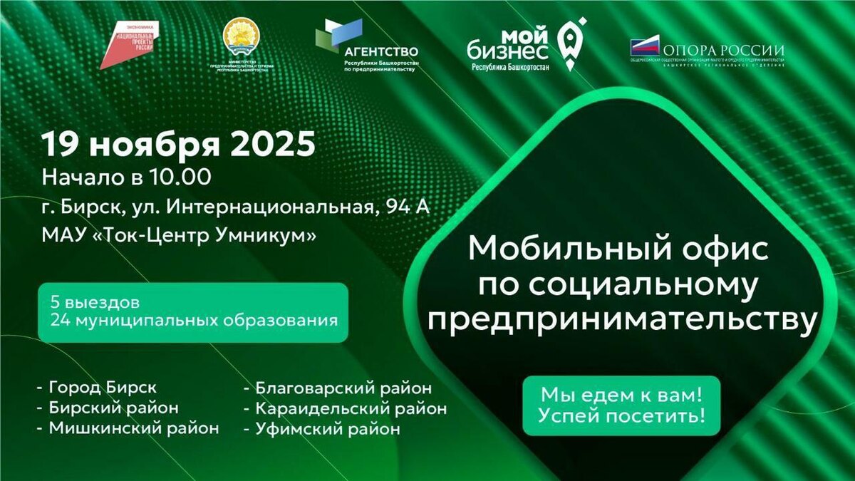 19 ноября с 10 до 16 часов в ТОК-центре «Умникум» будет работать площадка для социальных предпринимателей, а также предпринимателей и самозанятых, планирующих осуществление деятельности в социальной сфере. Приглашаются предприниматели Бирского, Мишкинского, Благоварского, Караидельского и Уфимского районов. Действующие социальные предприниматели поделятся своими историями успеха и проведут мастер класс – как быстро и без ошибок подать заявку на получение статуса «Социальное предприятие». Спикерами выступят представители министерства предпринимательства и туризма Республики Башкортостан, администрации Бирского района, Башкирского регионального отделения «ОПОРА РОССИИ», социальных предприятий республики. Мероприятие организовано в рамках нацпроекта «Эффективная и конкурентная экономика». Регистрация участников доступна по ссылке: