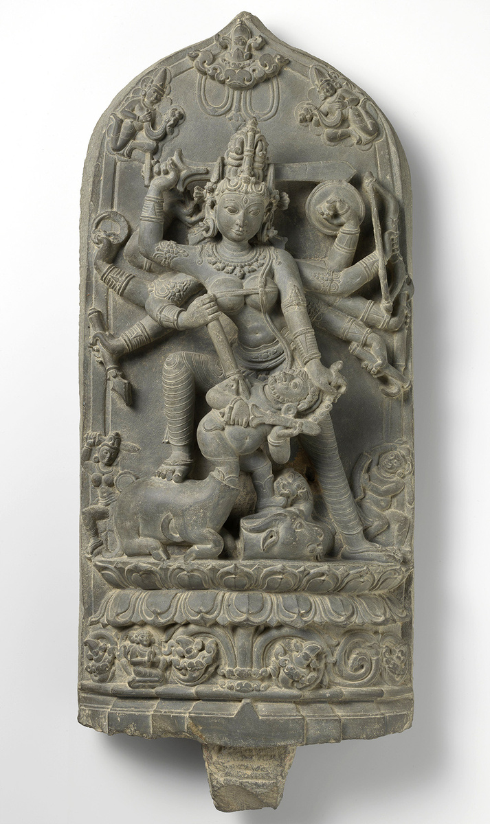 В древнеиндийском мифе о Дурге боги были изгнаны демонами, потеряв власть над миром. И вместе они создают богиню, достаточно сильную, чтобы победить царя демонов: Дургу. Дурга стоит на фоне, сужающемся кверху. Благодаря такой форме и деталям статуи ее можно датировать 11 веком. Могучим ударом своего меча Дурга отрубила голову демону-буйволу. Она держит меч в воздухе наготове на случай, если придется нанести ещё один удар. Дурга означает "непроницаемый" или "тот, до кого трудно добраться". Она является противоположностью традиционной индуистской женщины 11 века. Она не покорна и не зависит от мужчины и может драться гораздо лучше, чем все мужчины вместе взятые. В боку буйвола можно увидеть метательный диск, и Дурга держит точно такое же оружие в одном из своих рук. Скульптура показывает два разных последовательных момента: когда Дурга бросает диск и когда она попадает в буйвола. Дурга правой рукой ищет стрелу в колчане на спине. Скульптор удачно использовал толщину камня. У статуи не м