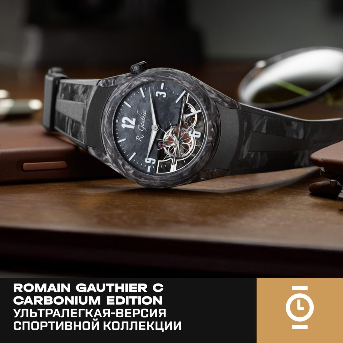 ROMAIN GAUTHIER C CARBONIUM EDITION — УЛЬTРАЛЕГКАЯ-ВЕРСИЯ СПОРТИВНОЙ КОЛЛЕКЦИИ #новости_WD Romain Gauthier представил новую интерпретацию своей спортивной линейки C — модель C Carbonium Edition в корпусе из аэрокосмического композита Carbonium. Это самый лёгкий и технологичный вариант коллекции, ранее выполненной в платине и титане. Корпус диаметром 42 мм сохраняет фирменную бочкообразную форму, скаллопированный безель (это безель, у которого края оформлены в виде равномерных вырезов или «зубцов») и смещённую к «2 часам» заводную головку. Толщина часов составляет 9,6 мм, а вес — всего 43 грамма вместе с ремешком, что стало возможным благодаря структуре Carbonium с высокой плотностью углеволокон. Циферблат выполнен в стиле частичного скелетона с сапфировыми элементами и вставками из Carbonium, открывающими детали титаново-карбониевого механизма. Индексы и цифры покрыты Super-LumiNova, а цветовые акценты предлагаются в пяти вариантах. Стрелки изготовлены из титана Grade 5. Внутри ус